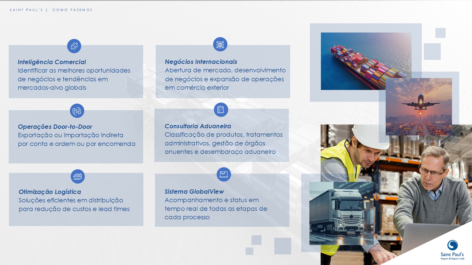A Saint Paul’s conta com a mais completa e eficiente estrutura para planejar, executar, gerenciar e garantir os melhores resultados em exportação e importação, garantindo excelência operacional com visibilidade, segurança e controle em cada etapa do processo.