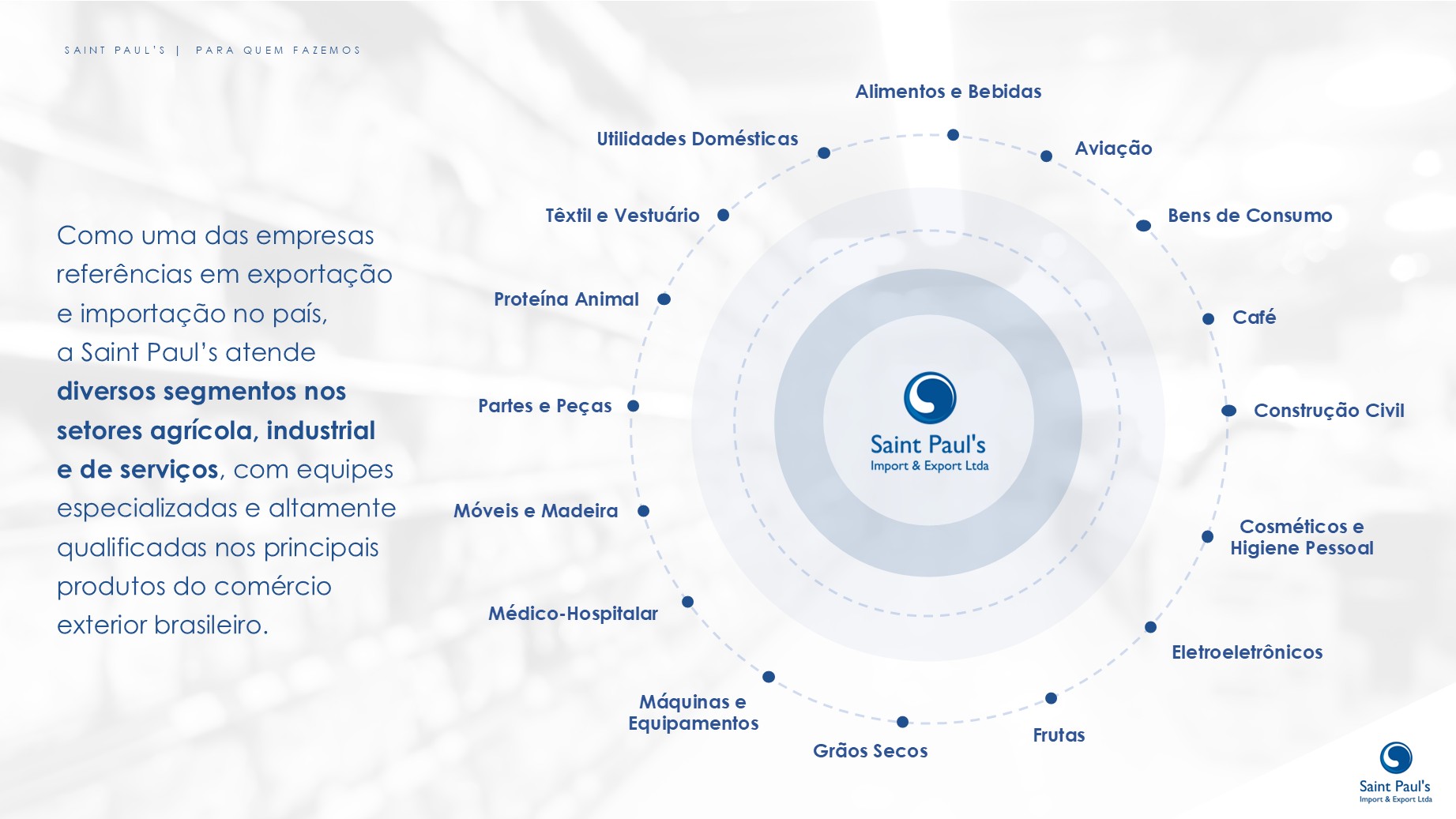 Como uma das empresas referências em exportação e importação no país, a Saint Paul’s atende diversos segmentos nos setores agrícola, industrial e de serviços, com equipes especializadas e altamente qualificadas nos principais produtos do comércio exterior brasileiro.