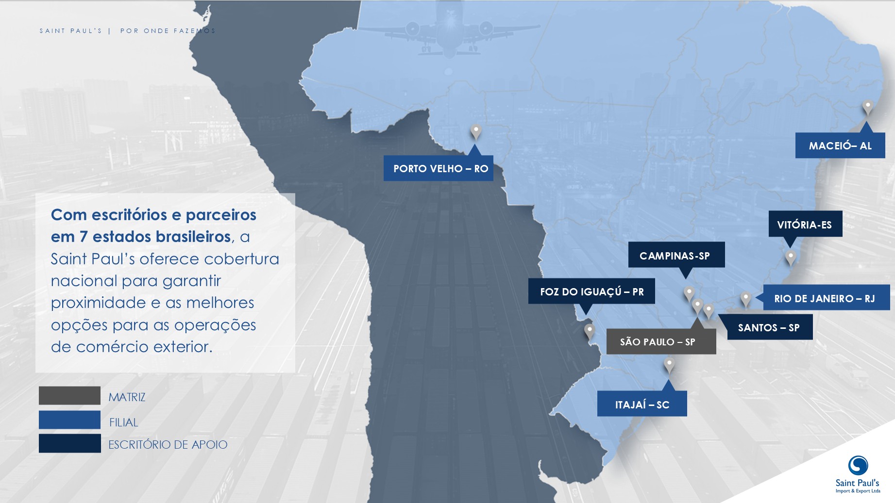 Com 9 escritórios e parceiros em 7 estados brasileiros, a Saint Paul’s oferece cobertura nacional para garantir proximidade e as melhores opções para as operações de comércio exterior.