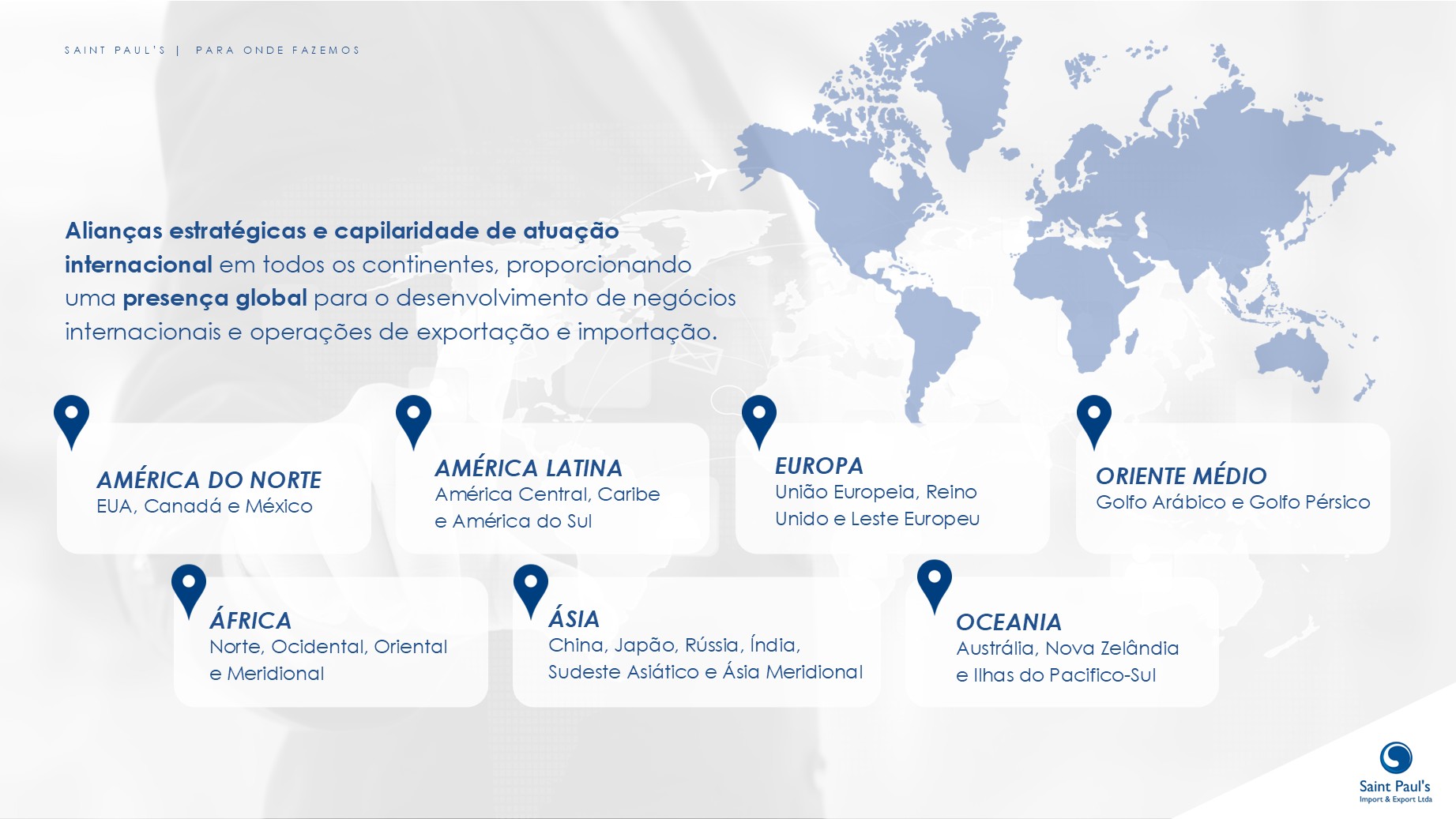 Alianças estratégicas e capilaridade de atuação internacional em todos os continentes, proporcionando uma presença global para o desenvolvimento de negócios internacionais e operações de exportação e importação.